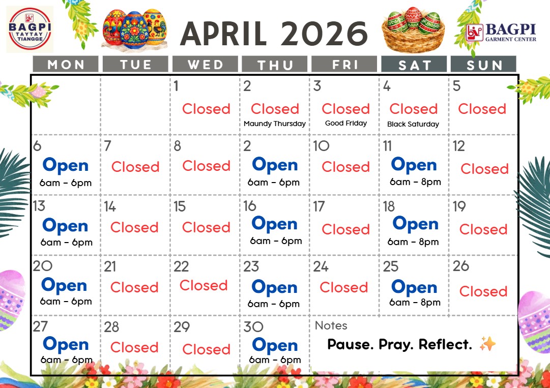 BAGPI Garments Center Taytay Schedule (Mar-2026)